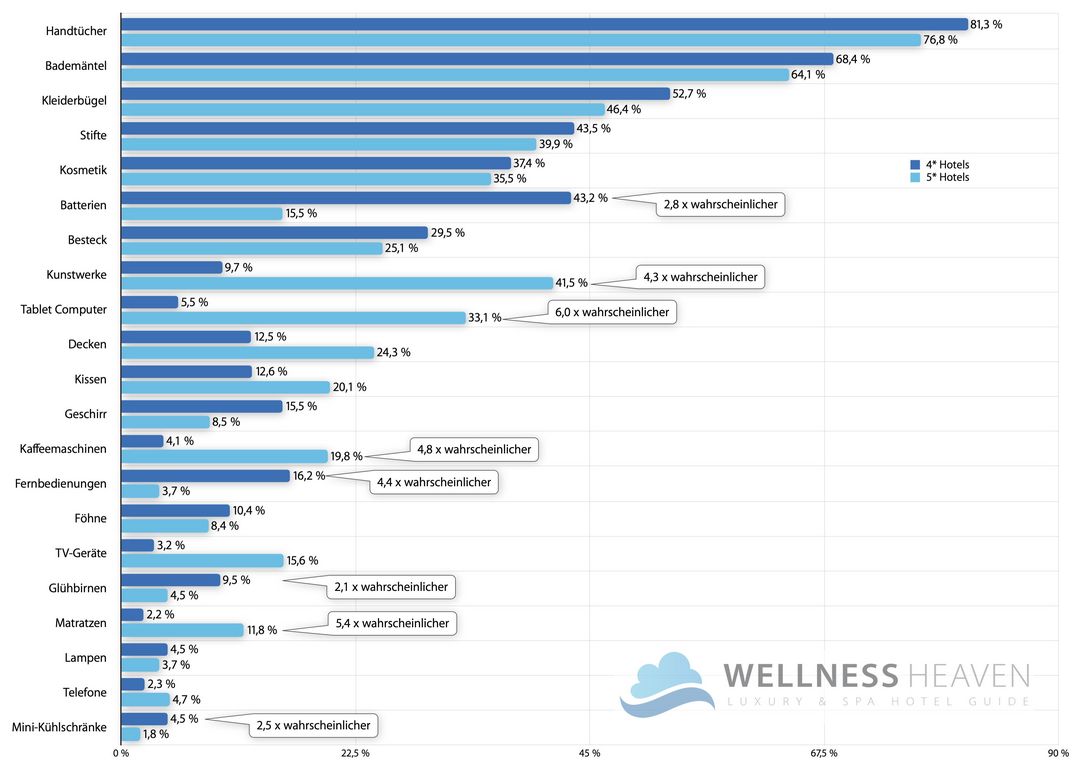 Das Mitnehmen von Seifen oder Stiften gilt vielen Hotelgästen als Kavaliersdelikt — doch dabei bleibt es bei Weitem nicht: Manche Besucher sind so dreist, dass sie Fernseher, Matratzen, Klaviere oder gar ausgestopfte Tiere aus dem Hotel tragen. Wellness Heaven hat dieses Jahr 1.376 Hoteliers befragt, welche Gegenstände am häufigsten entwendet werden. Besonders pikant ist das unterschiedliche Klauverhalten zwischen Gästen in 4-Sterne und 5-Sterne Hotels.