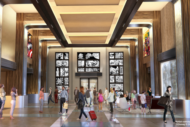 Ein neues Foto zeigt beispielsweise den Fortschritt in der Lobby mit einem der zahlreichen Marvel-Kunstwerke, die sich durch das gesamte Hotel ziehen werden. Das Vier-Sterne-Hotel ist von einer New Yorker Kunstgalerie inspiriert, eine Hommage an den Geburtsort vieler Marvel-Superhelden und vieler der Künstler, die sie geschaffen haben.