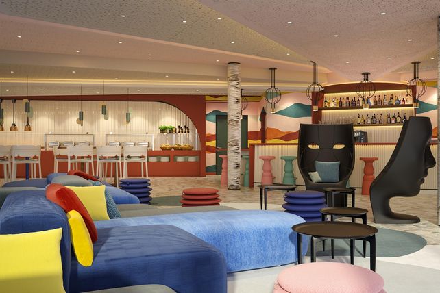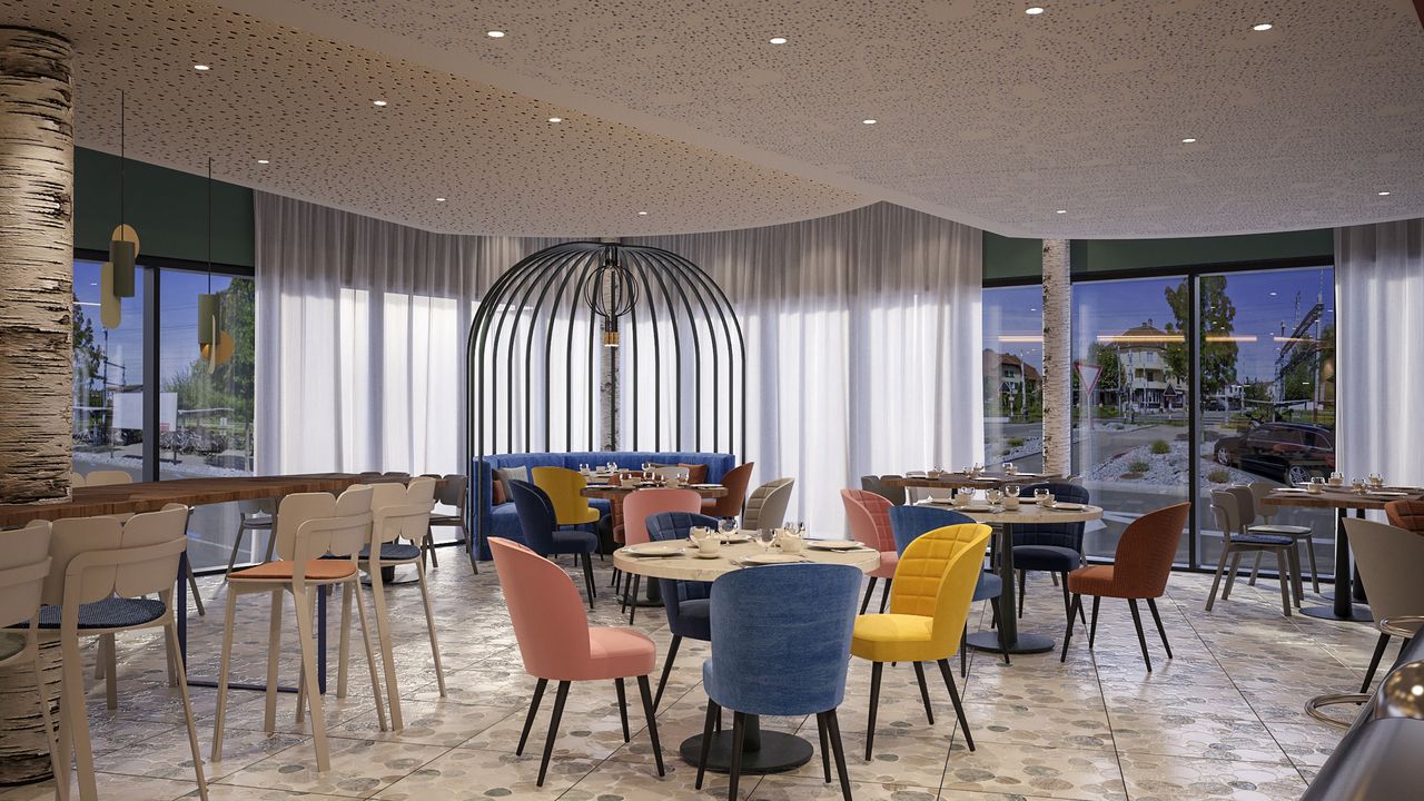 Das Farbkonzept kombiniert warme Pastelltöne in Blau, Gelb, Orange, Rosa und Türkis mit dunkelgrauen und weißen Materialien. Echtholzmöbel sorgen zusätzlich für Charakter. Viele Details sind direkt an die Umgebung des Hotels angelehnt. Die Säulen in der Lobby erinnern zum Beispiel an die Birkenstämme am Ufer des Alten Rheins. Die Sitzgruppe mit ihren Blau-Schattierungen symbolisiert das Wasser in Rhein und Bodensee. Der Boden im Restaurant ist gestaltet wie die Flusskiesel an den Ufern des Rheins. Und die Wand hinter der Bar zeigt die Silhoutte der Alpen.