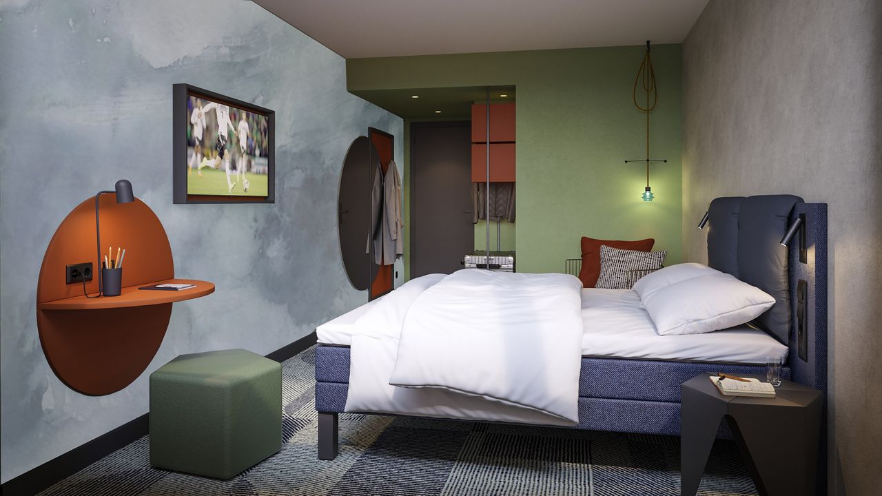 Wie für die Marke üblich, wurde auch für das neue ibis Styles St. Margrethen ein individuelles Designkonzept umgesetzt: Unter dem Motto „Das Runde muss ins Eckige“ ist hier allerdings nicht der Fussball gemeint, sondern die auffälligen Formen des gesamten Hotelinterieurs. Dazu gehören runde Spiegel und kubische Garderobenkästen, aber auch dynamische Bogengänge, geschwungene Lampenschirme oder halbrunde Erker, die einen Kontrast zu eckigen Fliesen und Regalen bilden.