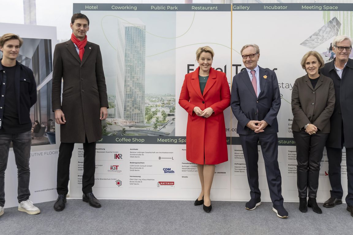 Berlins neues Wahrzeichen, der Estrel Tower, ist am Mittwoch der Öffentlichkeit präsentiert worden. Im Beisein von Franziska Giffey, designierte Regierende Bürgermeisterin von Berlin, und Martin Hikel, Bürgermeister von Neukölln, stellten die Bauherren Ekkehard und Maxim Streletzki sowie die Architekten Regine Leibinger und Frank Barkow das Großprojekt an der Sonnenallee vor. Mit 176 m Höhe wird der Tower Berlins höchstes Hochhaus und Deutschlands höchstes Hotel.