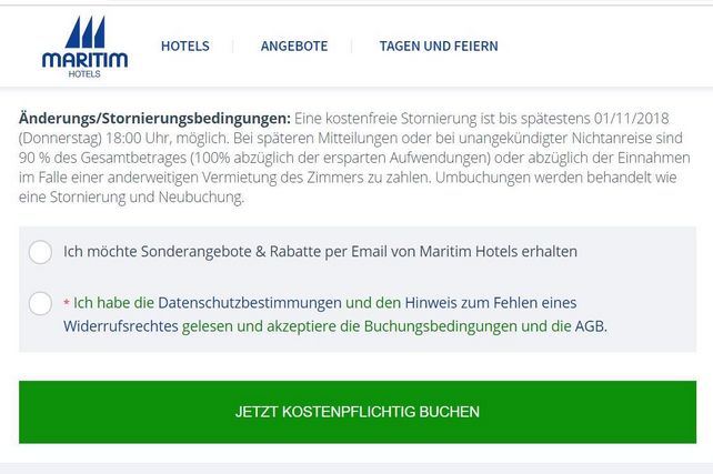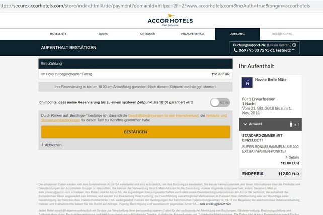 Ein kleiner Test zeigt aber: Auch führende Hotelgruppen halten sich in Deutschland nicht an die Button-Lösung, wie sie vom Gesetzgeber gefordert wird. Marktführer Accor beschriftet seine Buttons mit einem einfachen „bestätigen“