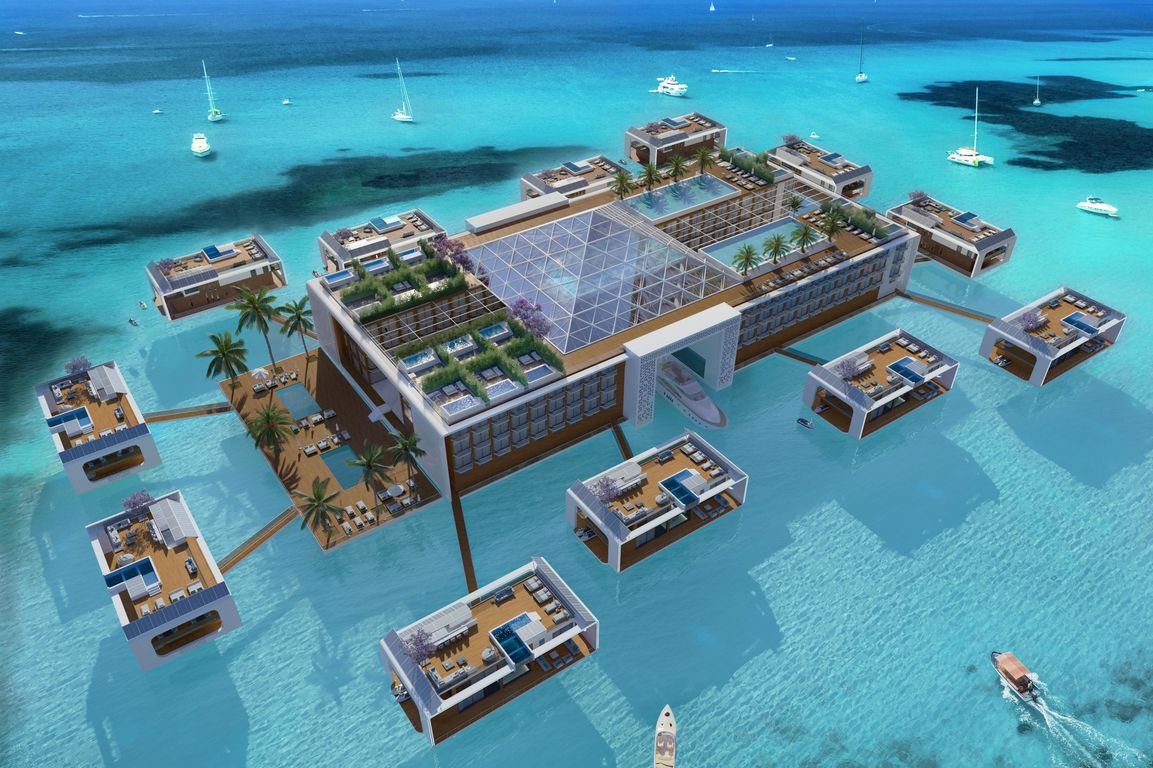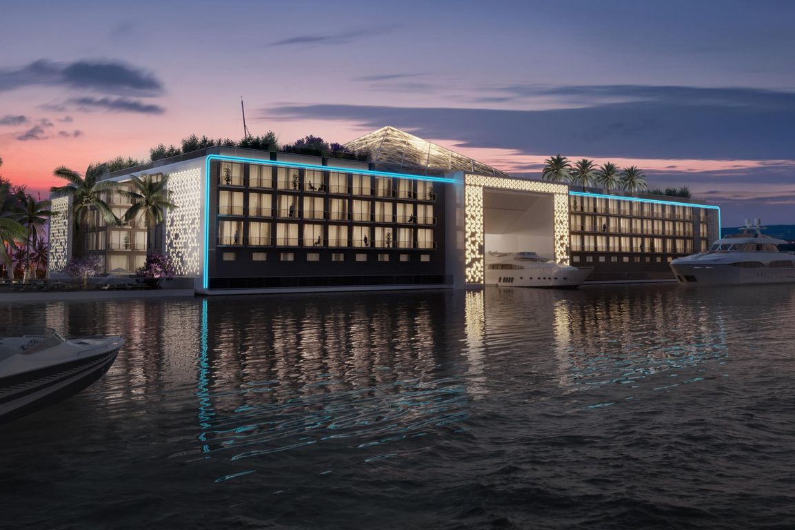 Das in vier Teile strukturierte Hauptgebäude wird in der Mitte durch eine Glas-Pyramide verbunden und bietet von exklusiven Gourmet-Restaurants, Bars, Spa, Pools, Boutiquen und Bankettbereichen jeglichen Luxus eines 5-Sterne Hotels. In der Mitte des Hotels können sogar grössere Yachten ein- und ausfahren und die Gäste gebührend ankommen lassen. Die 12 mit Stegen verbundenen Luxusvillen sind teilweise zum Verkauf, aber auch als Mietobjekte für Hotelgäste vorgesehen und profitieren von sämtlichen Services, die im Hotel angeboten werden. Hochwertiges und elegantes Design auf zwei Etagen mit Dachterrasse und Infinity Pool, zur Auswahl mit zwei, drei oder vier Schlafzimmern, Crew und Angestellten Zimmer sowie Indoor- und Outdoor Wohnzimmer zeichnen die Luxus-Hausboote mit grossen Panoramafenstern und allen technischen Angeboten eines Smart Homes aus. Die bei einer Maximalgeschwindigkeit von 6 Seemeilen fahrenden Villen verfügen über Solarzellen und sind umweltfreundlich konzipiert.