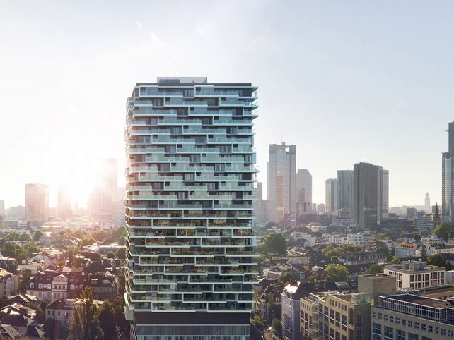 Der Rohbau steht, nun wird die Fassade hochgezogen: Das Hotel- und Wohnhochhaus «One Forty West» an der Frankfurter Senckenberganlage nimmt zunehmend Gestalt an. 28 der 41 Obergeschosse sind mittlerweile mit Fassade versehen. Auch der Balkon für das öffentlich zugängliche Restaurant mit Panoramablick ist bereits im 16. Stock angebracht worden, wie bei einer Begehung der Baustelle am Donnerstag deutlich wurde. Nach der Fertigstellung wird das Gebäude 140 Meter hoch sein.