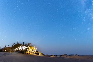 Die gerade ein Jahr alte Shipwreck Lodge am Skeleton Coast Park Namibias gehört definitiv zu den außergewöhnlichsten Unterkünften überhaupt. Die Lodge umfasst acht Chalets, welche dem Stil eines Schiffwracks nachempfunden wurden und Platz für jeweils zwei Gäste bieten. Mit einem Auge fürs Detail, der Verwendung von natürlichen Materialien und einer erdigen Farbgebung, die die Farben der Wüste widerspiegelt, entsteht ein modernes und stylishes Ambiente zum Wohlfühlen. Das imposante Hauptgebäude der Unterkunft ist auf einer Holzplattform erbaut und erinnert durch seine Form und Architektur an die, für die Skelettküste so typischen, Schiffswracks.