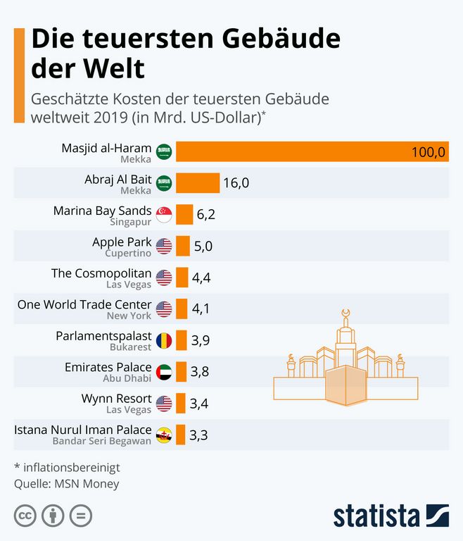 MSN Money hat die zehn teuersten Gebäude der Welt recherchiert. Auf dem ersten Platz landete dabei mit großem Abstand die al-Haram Moschee (Masjid al-Haram) im saudi-arabischen Mekka. Der Bau soll stolze 100 Milliarden US-Dollar verschlungen haben. Der Gebäudekomplex mit rund 400.000 Quadratmetern beherbergt im Zentrum das islamische Heiligtum Kaaba.