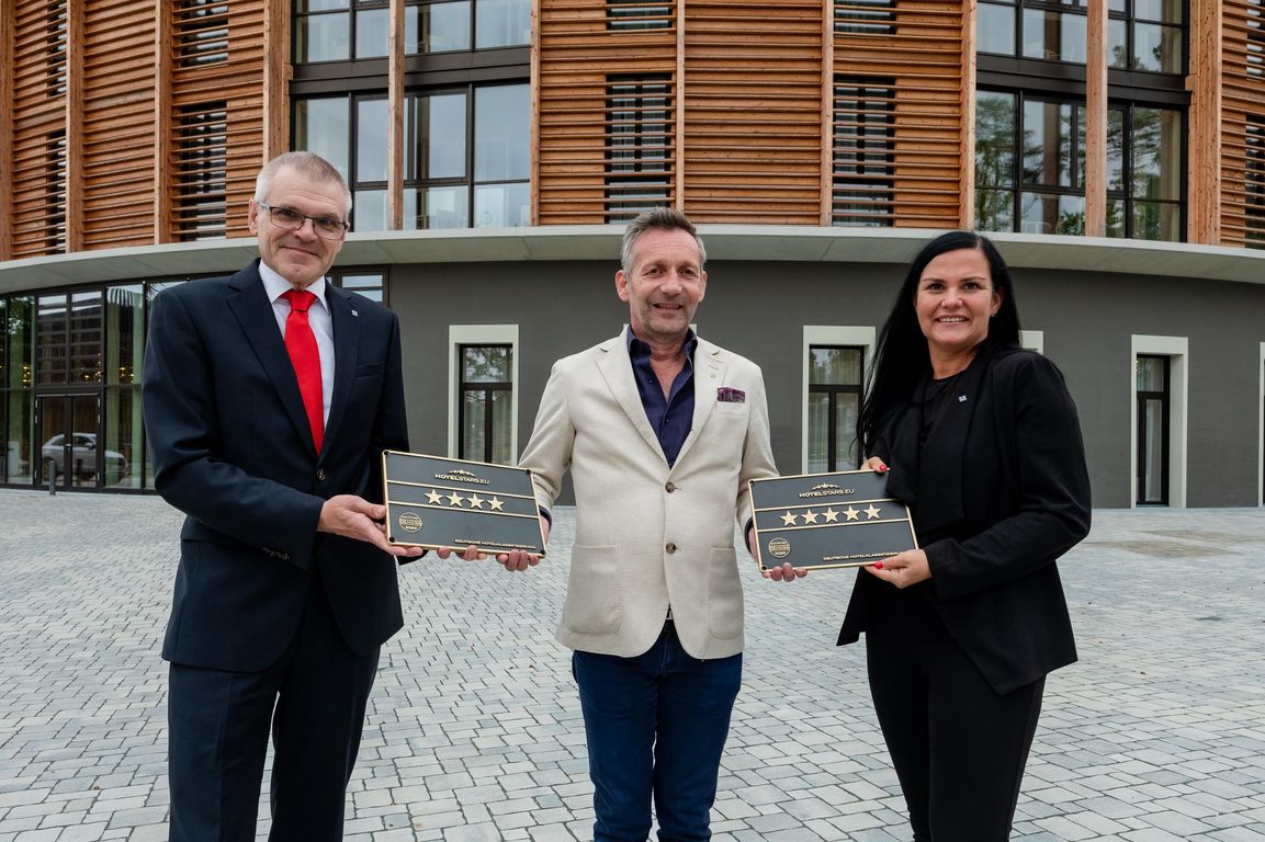 Das Patientenhotel erhält für die Hotelleistungen die höchste deutsche Hotelklassifizierung. Die Sternetafel wurde am Donnerstag, 8. Oktober, durch den Deutschen Hotel- und Gaststättenverband Thüringen (DEHOGA Thüringen) übergeben. Thüringens DEHOGA-Hauptgeschäftsführer Dirk Ellinger überbrachte die entsprechende Urkunde und die Plaketten. Der erste Gast wird am Donnerstag, 31. Oktober, in den mit Sternen ausgezeichneten Neubau des Patientenhotels der Waldkliniken einchecken.