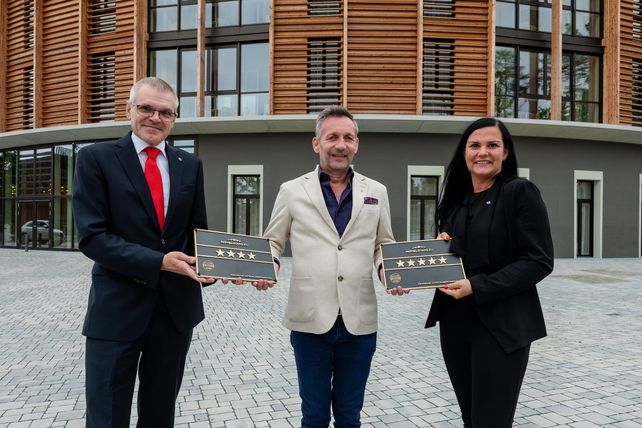 Das Patientenhotel erhält für die Hotelleistungen die höchste deutsche Hotelklassifizierung. Die Sternetafel wurde am Donnerstag, 8. Oktober, durch den Deutschen Hotel- und Gaststättenverband Thüringen (DEHOGA Thüringen) übergeben. Thüringens DEHOGA-Hauptgeschäftsführer Dirk Ellinger überbrachte die entsprechende Urkunde und die Plaketten. Der erste Gast wird am Donnerstag, 31. Oktober, in den mit Sternen ausgezeichneten Neubau des Patientenhotels der Waldkliniken einchecken.
