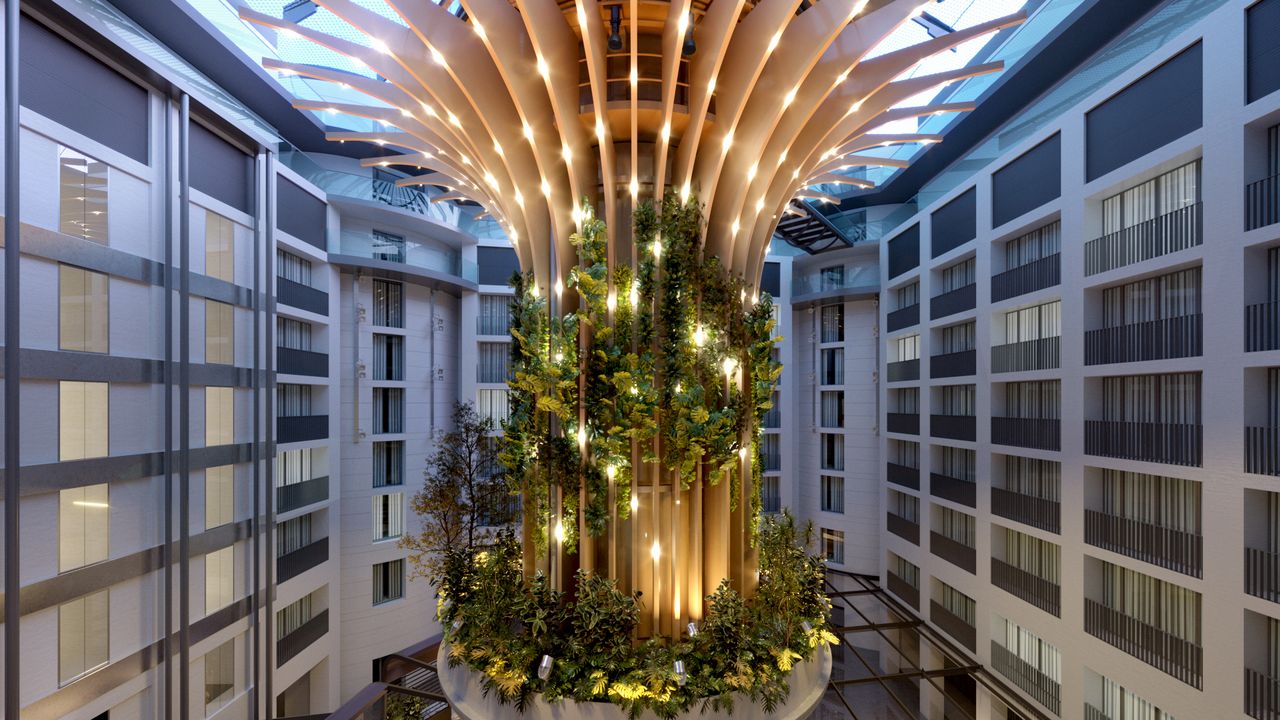 Knapp 2.000 Pflanzen 22 unterschiedlicher Arten, an 36 baumartigen Vertikal-Lamellen gepflanzt und je nach Tageszeit variantenreich illuminiert, werden in der Lobby und im neugestalteten Barbereich des Hotels eine besondere Atmosphäre schaffen und vor allem den Hotelgästen der innenliegenden Zimmer einen spektakulären An- und Ausblick bieten. Das hochwertige Design des „Living Tree“ mit einem hochragenden Stamm - 6,5 Meter im Durchmesser - wird abgerundet durch eine abstrakte Baumkrone, welche bis unter das transparente Dach des Atriums reicht, in 24 Meter Höhe und 20 Meter in ihrem Durchmesser.