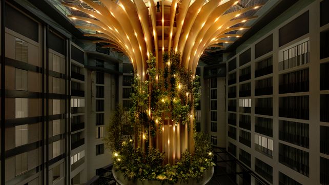 Das Radisson Collection Hotel im Berliner DomAquarée geht mit einem neuen Lobbykonzept wieder an den Start. Zur Wiedereröffnung voraussichtlich Ende des Jahres wird ein 16 Meter hoher, bis ins sechste Stockwerk reichender und rund 120 Quadratmeter umfassender Vertikaler Garten den neuen Mittelpunkt der Hotellobby bilden.