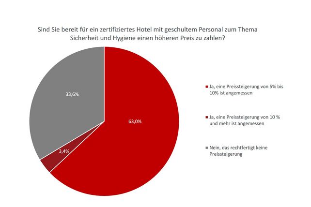 Zu den bemerkenswerten Erkenntnissen aus der Umfrage gehört unter anderem, dass 65 Prozent der Unternehmen zuvor geplante Präsenzveranstaltungen künftig im hybriden oder digitalen Format durchführen wollen. Bei Preissteigerungen durch gestiegene Hygieneanforderungen zeigt sich, dass die Preise derzeit offenbar nicht im Fokus der Geschäftsreisenden stehen: Zwei Drittel der befragten Firmen sind in der Umfrage bei gestiegenen Sicherheits- und Hygienemaßnahmen im Hotel mit einer Preissteigerung einverstanden. Davon sind 63 Prozent der Unternehmen bereit, einen höheren Preis von 5 bis 10 Prozent zu zahlen, 3,4 Prozent der Firmen würden sogar eine Preissteigerung von 10 Prozent und mehr akzeptieren. Für nur 33,6 Prozent der Unternehmen rechtfertigen höhere Hygienemaßnahmen im Hotel keine Preissteigerung. Generell rechnen künftig mehr als die Hälfte der Unternehmen mit einem Anstieg der Firmenraten aufgrund der behördlichen Vorschriften und Auflagen für Hotels und 42,7 Prozent gehen davon aus, dass die Raten stabil wie vor der Krise bleiben werden.