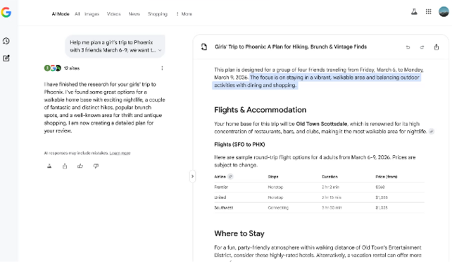 Dieser Plan integriert unter anderem Echtzeit-Suchdaten für Hotels und Flüge sowie Details von Google Maps (Fotos, Bewertungen). Canvas unterstützt Nutzer bei Hotelvergleichen basierend auf Preis und Ausstattung und hilft bei der Abwägung von Kompromissen – beispielsweise zwischen einem Hotel in Nähe eines Brunch-Lokals oder in Nähe von Wanderwegen.