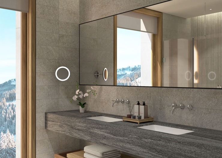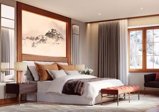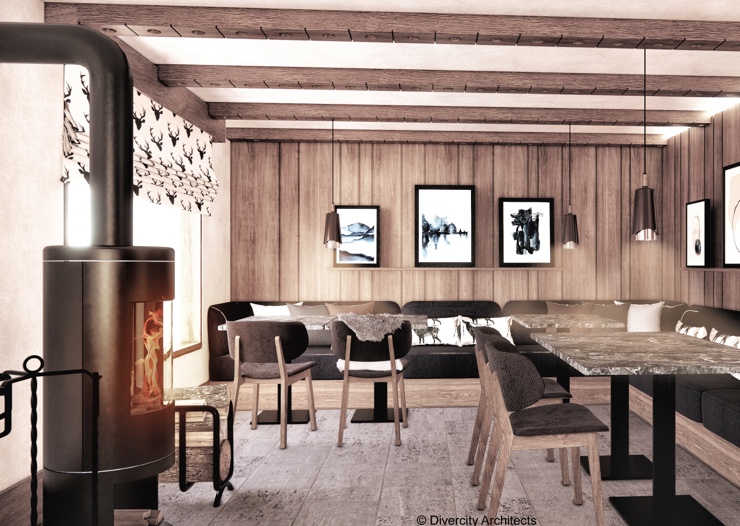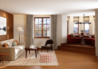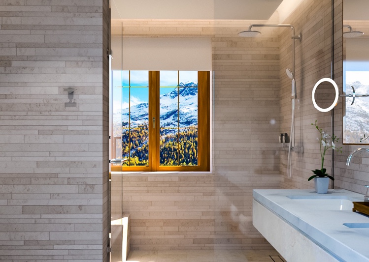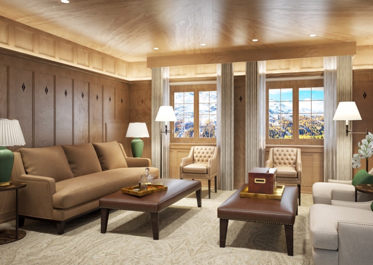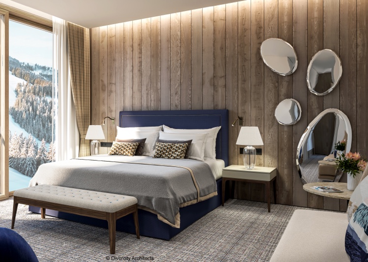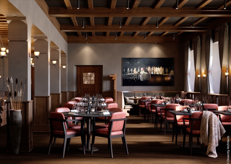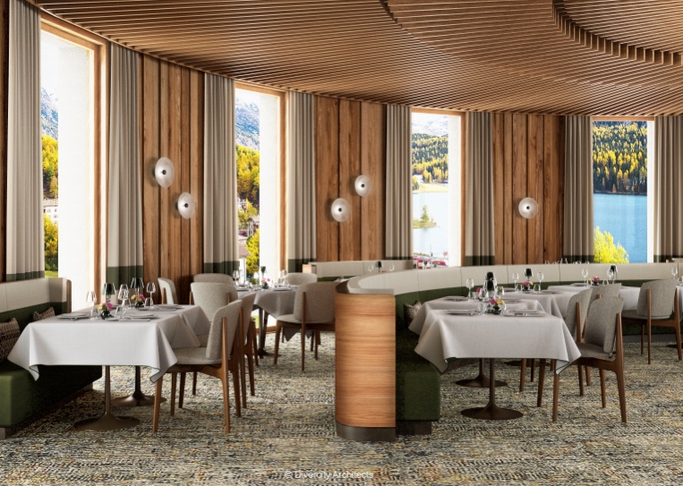 Auf einer Reihe von Terrassen, die der natürlichen Neigung folgen, fügt sich der dezente Anbau harmonisch in die Landschaft ein. Bewusst unauffällig hebt der neue Gebäudeflügel die traditionelle Architektur und die atemberaubende Alpenkulisse hervor. Panoramafenster und offene Innenräume schaffen ein Gefühl von Licht und Raum und bilden so einen bewussten Gegensatz zu den dunklen, holzverkleideten Chalets und opulenten Prachtpalästen vor Ort. Nicolas Travasaros von Divercity Architects beschreibt das Projekt wie folgt: „Die grösste Herausforderung für uns bestand darin, den Dialog zwischen dem historischen Erbe und den zeitgenössischen Anforderungen an ein Hotel im 21. Jahrhundert herzustellen und harmonisch wirken zu lassen.“