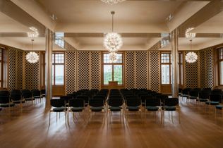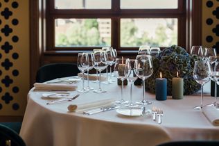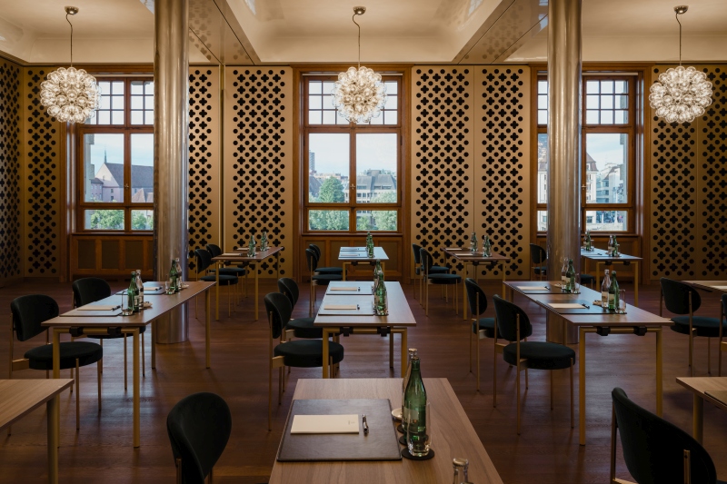 Im ersten Obergeschoss bieten wandelbare Veranstaltungsräume Platz für Konferenzen, Feiern und exklusive Abendessen. Die Ausstattung mit moderner Technik sowie edlen Materialien wie Messing und Samt verleiht den Räumen ein hochwertiges Erscheinungsbild.
