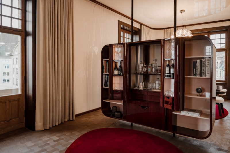 Ein besonderer Blickfang ist die Suite des Rois, die mit fließenden Raumübergängen, einem privaten Dining Room und einem großzügigen Balkon zur Schifflände konzipiert wurde. Hochwertige Materialien wie Samt, Messing und dunkles Holz schaffen in Kombination mit maßgefertigten Möbeln ein Ambiente zwischen Intimität und Eleganz. Auch die Junior Suiten im dritten Obergeschoss setzen mit glänzenden Decken, samtroten Wandnischen und strukturierten Oberflächen auf markante Kontraste.