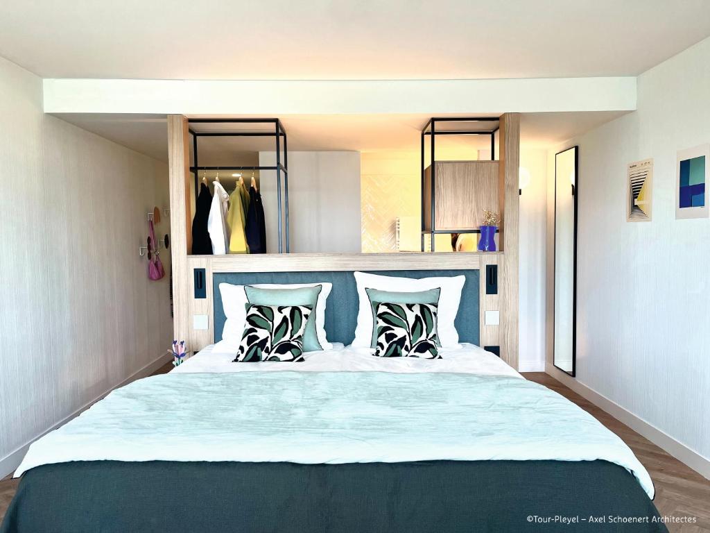 Der 140 Meter hohe Pleyel-Turm, benannt nach einer Klaviermanufaktur, die auf dem Gelände angesiedelt war, ist ein markantes Gebäude. Zuletzt als Bürogebäude genutzt beherbergt das Haus nach einer dreijährigen Umbauphase 697 geräumige Zimmer mit einer Größe von 21 bis 129 Quadratmeter. Für die Innenarchitektur zeichnet die Agentur Axel Schoenert aus Paris verantwortlich. Sie verbindet auf subtile Weise die industrielle Vergangenheit des Viertels Pleyel mit einer zeitgenössischen Ästhetik. Rohe Materialien wie Stahl verbinden sich harmonisch mit edlem Holz und schaffen so eine authentische und moderne Atmosphäre.