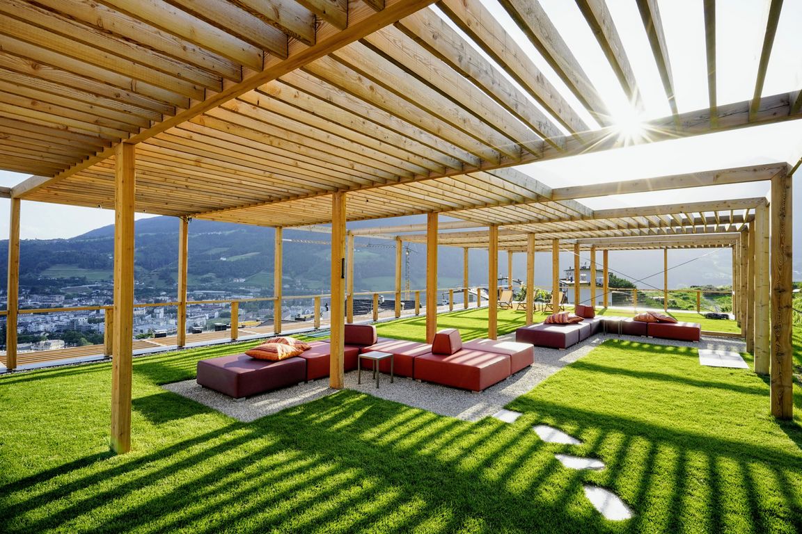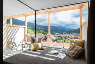 Ein alter Stadl mit Gasthof ist dem neuen Zimmertrakt gewichen, bestehend aus 15 hellen und puristisch eingerichteten Terrassen-Suiten und Drei- Eck-Suiten. Trockenmauern, Stein und Terrassierungen integrieren sich ebenso in die Landschaft wie das natürlich verwitternde Lärchenholz. Höhepunkt in Sachen „schöne Aussicht“ ist der Rooftop Garden im vierten Stock des Neubaus.