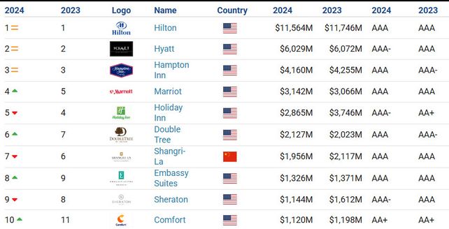 Hilton bleibt zum neunten Mal in Folge die wertvollste Hotelmarke der Welt. Laut dem aktuellen Hotel-Ranking von Brand Finance liegt der Markenwert bei 11,6 Milliarden US-Dollar, trotz eines leichten Rückgangs um 2 Prozent. Hinter Hilton folgen Hyatt mit 6,0 Milliarden US-Dollar und Hampton Inn mit 4,2 Milliarden US-Dollar. Marriott konnte mit einem Anstieg um 3 Prozent auf 3,1 Milliarden US-Dollar an Holiday Inn vorbeiziehen, das 24 Prozent seines Markenwerts einbüßte und nun auf Platz fünf liegt.