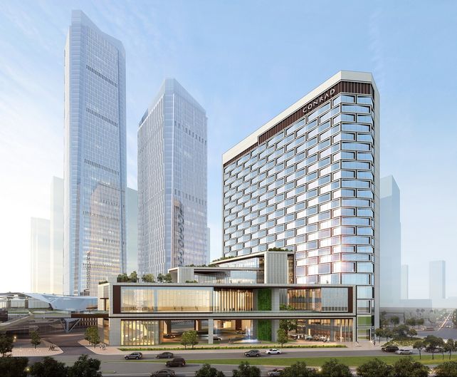 Conrad Shenzhen-Shenzhen, China (Frühjahr 2023): Das Conrad Shenzhen befindet sich im zentralen Geschäfts- und Finanzviertel und wird von der internationalen Firma Yabu Pushelberg entworfen. Das Design steht unter dem Motto "A Story of a Dreamer" (Die Geschichte eines Träumers) und soll eine Atempause vom geschäftigen Treiben der Stadt bieten. Nach seiner Eröffnung wird es 300 Zimmer und Suiten, internationale Restaurants und über 1.500 Quadratmeter Tagungsfläche umfassen.