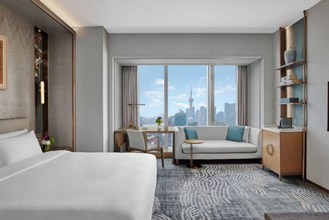 Mit Blick auf die Fußgängerzone Nanjing Road in Shanghai liegt das Conrad Shanghai in einem 66 Stockwerke hohen Wolkenkratzer. Das Hotel bietet 728 Zimmer und Suiten mit raumhohen Fenstern.