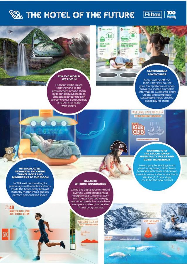 Intergalaktische Ausflüge, Fast-Food-Nährstofftabletten, Arbeitstage mit zwei bis drei Stunden und personalisierte Räume, in denen die Gäste im Dschungel oder Gebirge übernachten: Zum 100-jährigen Jubiläum wagt Hilton (NYSE: HLT) einen Ausblick, wie sich die Branche in den nächsten 100 Jahren entwickelt. In einem von Hilton initiierten Report, der in Zusammenarbeit mit Experten aus den Bereichen Nachhaltigkeit, Innovation, Design, zwischenmenschliche Beziehungen und Ernährung entstanden ist, zeigt sich die zunehmende Komplexität von Technologie und Klimawandel in der Hotelbranche.