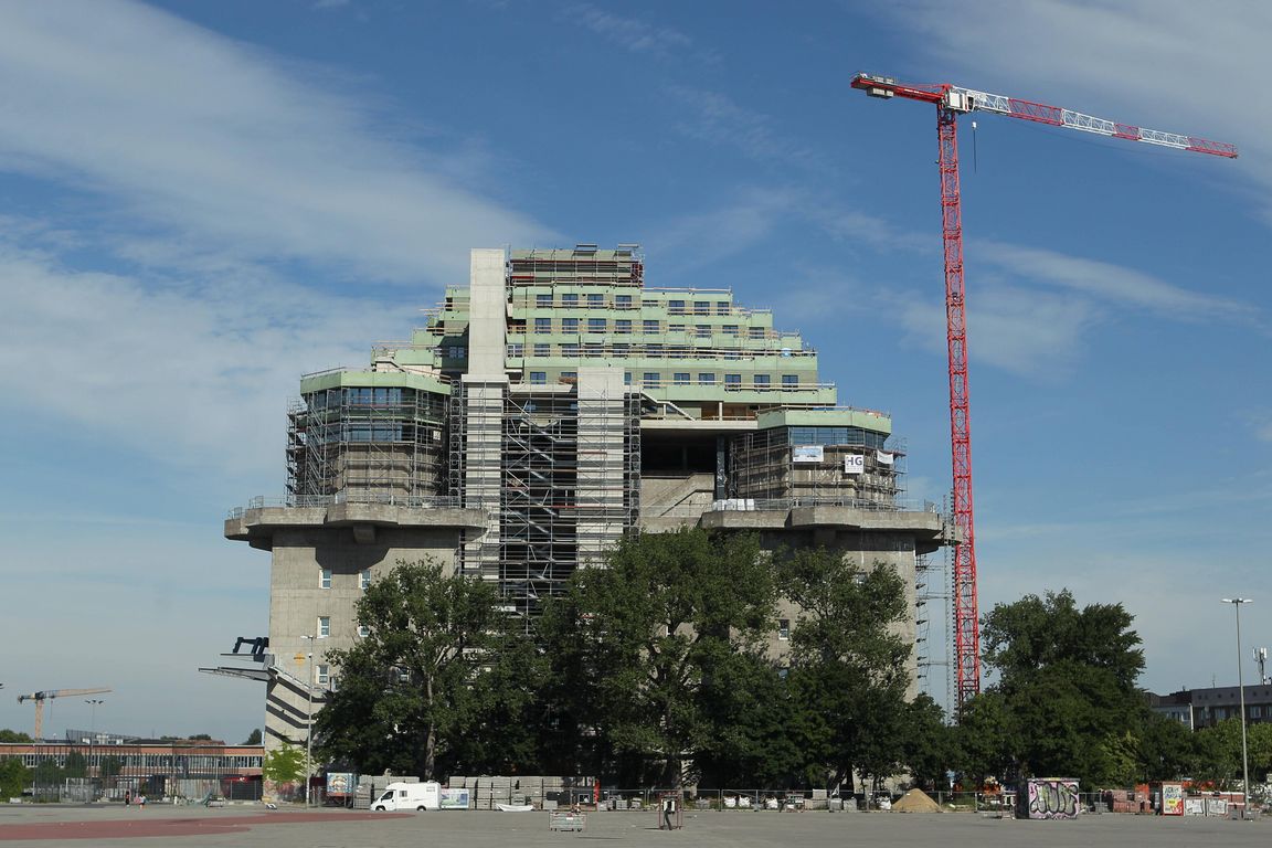Der grüne Bunker auf St. Pauli nimmt weiter Gestalt an: Am Mittwoch wurde ein imposanter Fachwerkträger zwischen die beiden Flaktürme an der Bunker-Westseite montiert. Dabei wurde der Stahlkoloss mit zwei Kranen in die vorbereiteten Bohrlöcher und Aufnahmen an der Außenfassade bugsiert, wie die Verantwortlichen mitteilten. Für die Monteure und Kranführer sei es Millimeterarbeit gewesen, den 35 Tonnen schweren und 30 Meter langen Träger an die richtige Stelle zu setzen.