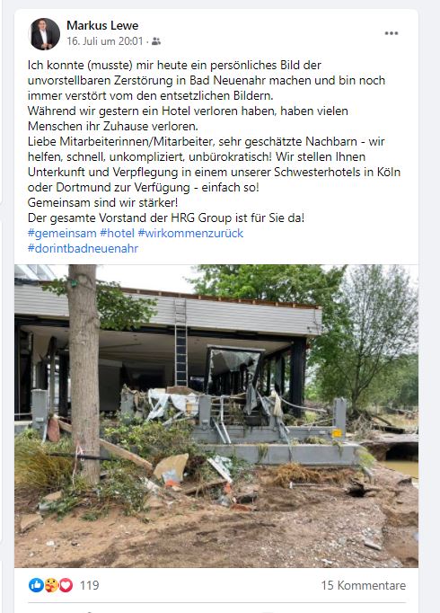 In den betroffenen Gebieten setzen die Hoteliers und Gastronomen alle Hebel in Bewegung, um zu helfen. So steht der DEHOGA in Nordrhein-Westfalen im Dialog mit den Katastrophenschutzteams und der Regierung, um kostenfreie Unterkünfte in Hotels und Verpflegung für die Opfer des Hochwassers und die Helfer zu organisieren. Wer hier etwas in den betroffenen Gebieten anzubieten habe, sei herzlich willkommen, wie der Präsident des DEHOGA Nordrhein Haakon Herbst bei Facebook mitteilte. Jede Stadtverwaltung freue sich über Hilfe. Es fehle an allem, so Herbst.