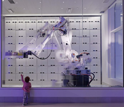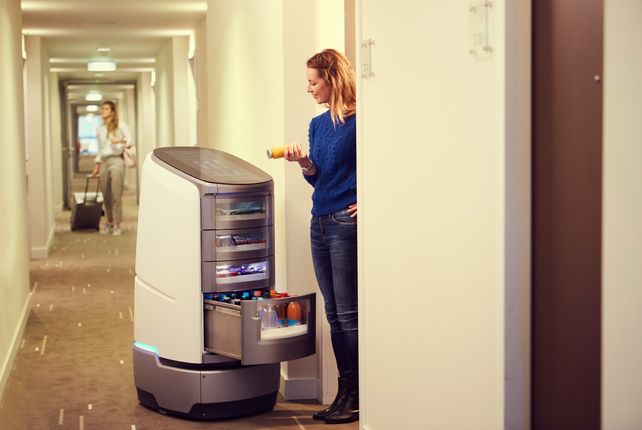 Im YOTEL New York City kümmert sich der Roboter YOBOT darum, den Koffer sicher zu verwahren. Mit seinem langen Greifarm nimmt er das Gepäck auf und stellt es in eines der 150 Gepäckfächer. Der Gast erhält einen Barcode, mit dem er das Gepäck bei der Abreise einfach wieder abholen kann. Mit seinem futuristischen Aussehen ist der Roboter auch ein beliebtes Selfie-Motiv für die junge Zielgruppe des Hotels.
