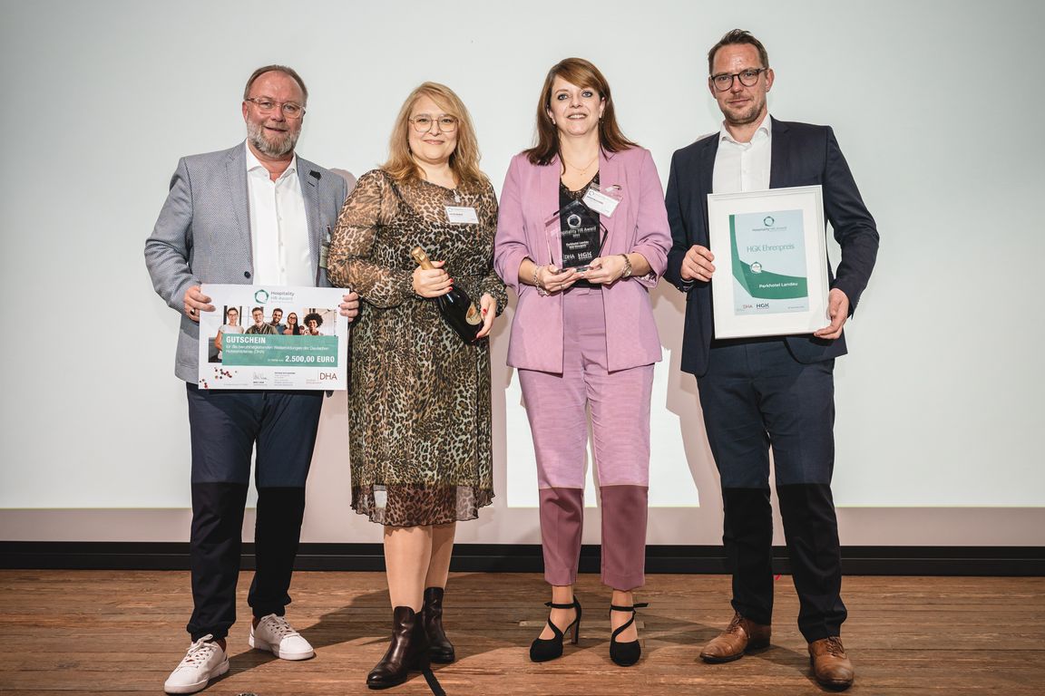 Unternehmerische Entscheidungen geleitet vom Wohl der Mitarbeitenden: Wie und dass es gelingen kann, zeigt das Parkhotel Landau, das für diese vorbildliche Unternehmensführung mit Alleinstellungsmerkmal mit dem HGK-Ehrenpreis ausgezeichnet wurde. „Das Parkhotel Landau berücksichtigt alle Stellschrauben: den einzelnen Mitarbeiter, der Raum für Entwicklung hat, das Miteinander im Team und die gesamte Organisation. Alles hängt miteinander zusammen und ergibt eine einzigartige Arbeitgebermarke“, so Tino Kaiser, Leiter Vertrieb und Digitale Lösungen, HGK.