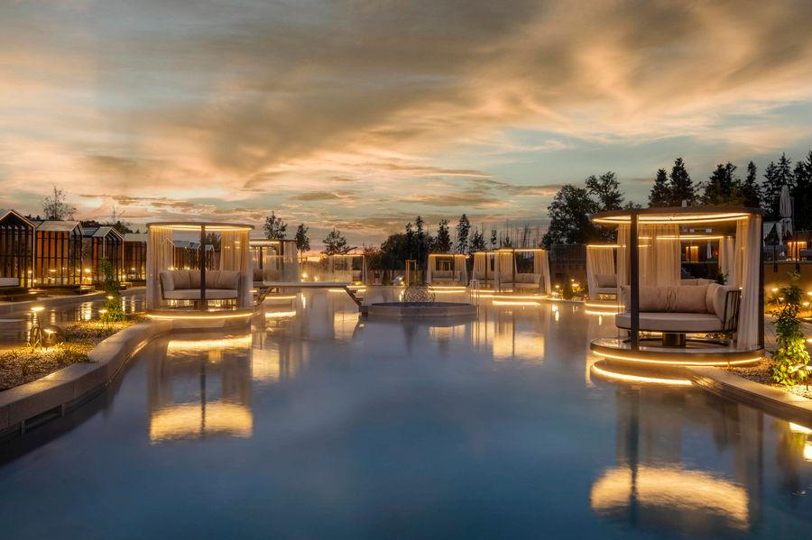 Zu den zentralen neuen Bereichen der Wellnesslandschaft zählen die Event-Seesauna, eine neue, große Sauna für intensive Aufgüsse und gemeinsames Erleben. Der Fokus liegt auf Ritualen und Wärme, die unter die Haut gehe. Weiterhin gibt es einen Schneeraum mit einer konstanten Temperatur von minus 10 Grad Celsius und feinem Schnee, der zur Abkühlung dient und für einen Frischekick sorgen soll. Er wird als „Raum der Stille, des Loslassens, der belebenden Klarheit“ beschrieben. Hinzu kommen ein 15 Meter langer Granit-Whirlpool, der nach Angaben des Hotels Kraft und Ruhe vereinen soll und eingebettet in die umgebende Natur ist, sowie der Stemp See, ein 60 Meter langer, beheizter Naturpool, der zum Schwimmen und „Rückverbindung mit sich selbst“ einlädt.