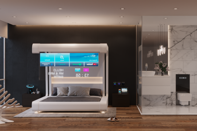 Wo heute noch nahezu jedes Hotelzimmer mit einem Fernseher ausgestattet ist, werden Entertainment- und Informationsinhalte in Zukunft nur noch auf Glasflächen projiziert werden. Minimalismus liegt im Trend, dementsprechend wird künftig Glas ein zentrales Gestaltungselement in Hotelzimmern sein: als transparente Trennwände, die auf Knopfdruck für mehr Privatsphäre abgetönt werden – oder eben als Wiedergabefläche für Medieninhalte, die der Gast per Smartphone oder Tablet steuern kann. Panasonic und andere führende Hersteller gehen mit seinen Prototypen für Glas-TVs erste Schritte.