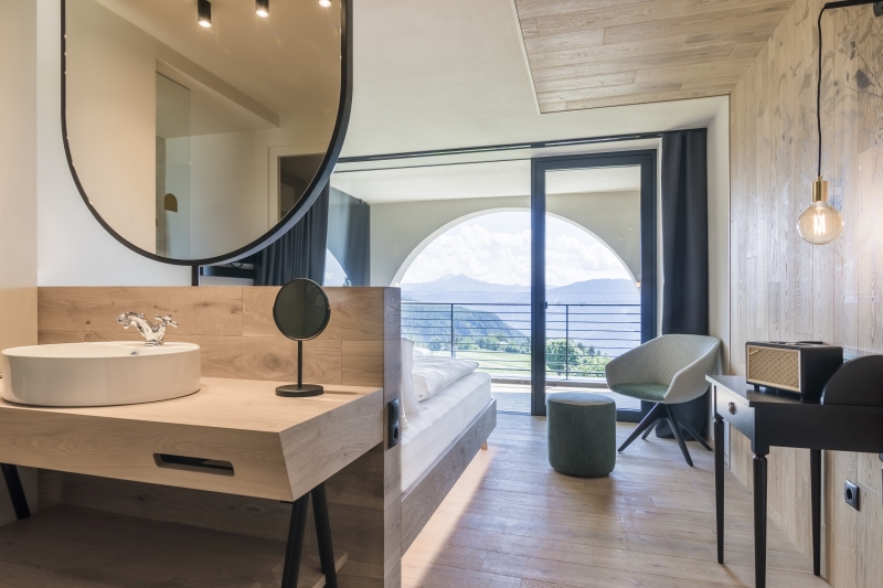 Auch im Inneren findet sich das heimische Holz wieder. Zusammen mit Lodenstoffen entsteht eine natürliche Wärme. Hochwertige, überwiegend regionale Materialien prägen den eleganten Stil. Große, helle Räume öffnen den Blick auf die Dolomiten und bieten Raum für Erholung. www.hotel-milla-montis.com