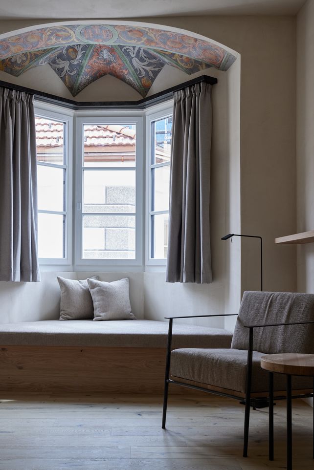 In den vergangenen Monaten unterzogen die Gastgeber Petra Hinteregger Fink und Florian Fink das seit über 125 Jahren familiär geführte Gasthaus einer Neugestaltung unter der Regie des Architekturbüros ASAGGIO aus Brixen. Das jahrhundertealte Haus sollte auch nach dem Umbau seinen historischen Charakter beibehalten: Die puristische Ausstattung aller Räumlichkeiten sorgt für eine nahezu klösterliche Atmosphäre. Die neun unterschiedlich großen Suiten sind auf drei Stockwerke verteilt, im Schnitt und in der Raumteilung unterscheiden sich die Räume jeweils, was dem historischen Grundriss der Gebäude geschuldet ist. Farbgebung und Möblierung sind jedoch in allen Suiten nahezu identisch.