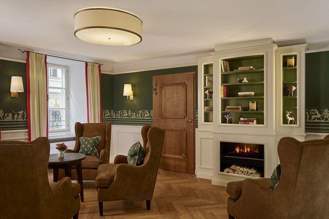 Angrenzend an den Rosa Salon, in dem nicht nur das Frühstück für Hotelgäste serviert wird, sondern auch Veranstaltungen stattfinden, ist ein Kaminzimmer entstanden. Meetings und Feierlichkeiten für bis zu 16 Personen finden ab sofort auch im neuen „Weinkabinett statt. Wie der Name schon vermuten lässt, hat hier die Weinsammlung des Hotels ihren Platz gefunden.