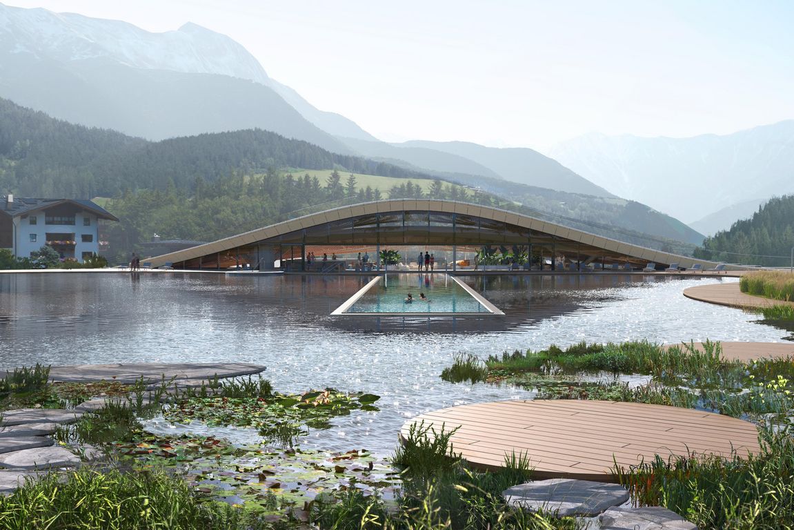 Die geschwungene Dachkonstruktion des neuen Spa-Gebäudes, welche sich über eine Länge von hundert Metern wölbt, soll sich nahtlos in den Grünraum des Außenbereichs einfügen.