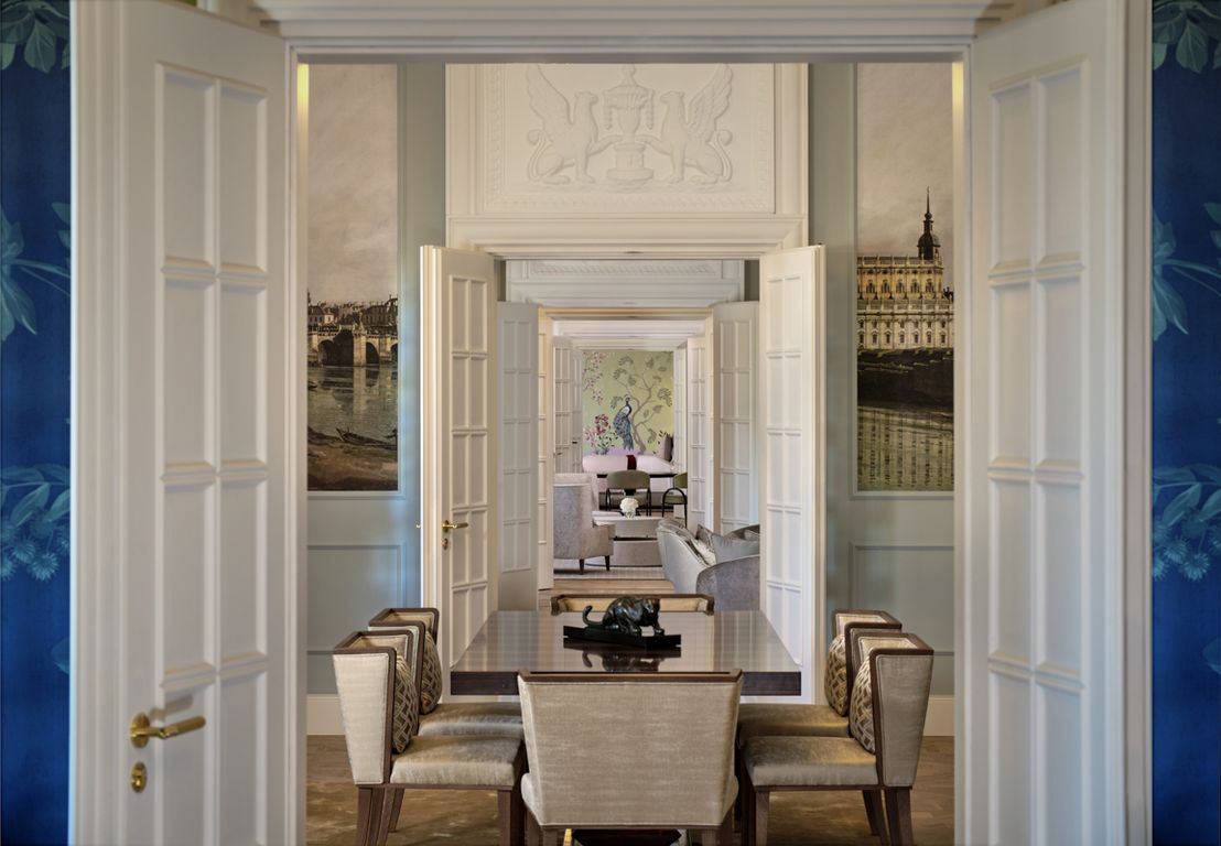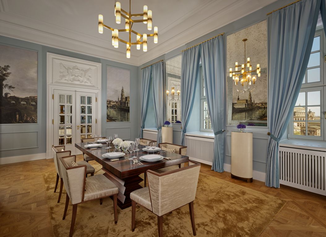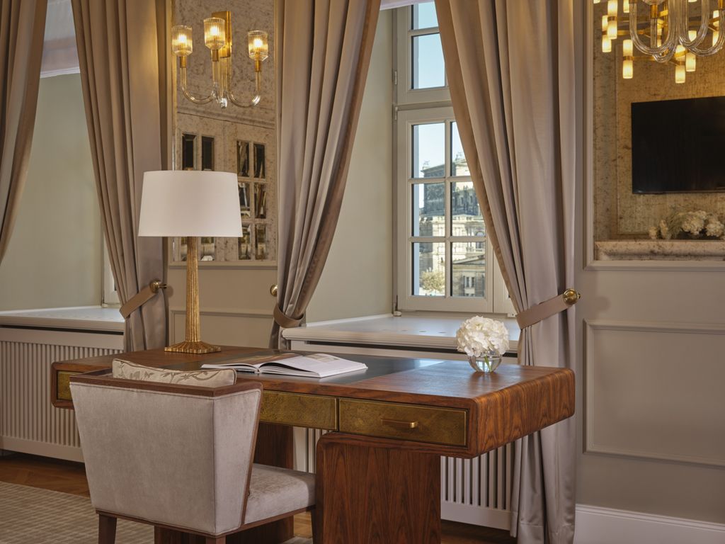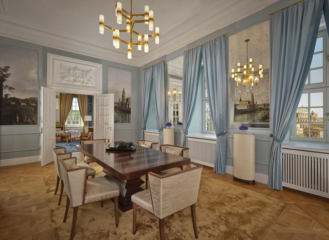 Nun hat das Haus die Royal Suite vorgestelltn: Mit einer stilvollen Einrichtung, ausgewählten Einzelstücken und modernen Annehmlichkeiten bietet sie anspruchsvollen Reisenden nur viel Raum und ein edles Interieur. So finden handgeknüpfte Teppiche Platz auf dem aus Eichenholz angefertigten und nach der Legetechnik benannten Parkett de Versailles. Die Wände sind mit Papier und Leinen-Tapeten geschmückt, deren Designs an historische Motive angelehnt sind. In Kooperation mit den Staatlichen Kunstsammlungen Dresden wurde ein Gemälde des venezianischen Malers Bernardo Bellotto in Übergröße reproduziert und zeigt das Dresdner Stadtbild im „Canaletto-Blick“ von 1748.