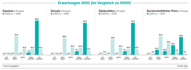 Rund die Hälfte (48 Prozent) der Hotelgruppen, die sich an der Umfrage beteiligt haben, machen sich bereit, 2021 wieder mehr Gäste zu empfangen als im Vorjahr. Mehr als die Hälfte (52 Prozent) der Unternehmen geht davon aus, in diesem Jahr auch etwas bessere Gewinne zu erzielen als 2020. Mit 56 Prozent ist zudem die Mehrheit der Hotelgruppen überzeugt, die Zimmerpreise 2021 im Vergleich zum Vorjahr steigern zu können.