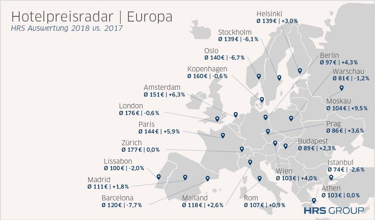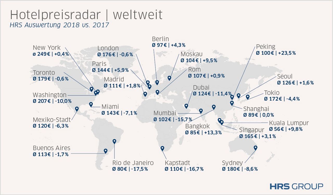 Zur Auswertung: Betrachtet wurden alle nicht stornierten Hotelbuchungen im Zeitraum 01.01.2018 bis 31.12.2018 über das Portal HRS. In der Auswahl berücksichtigt wurden Hotelpreise für sowohl Einzel- als auch Doppelzimmer, mit und ohne Frühstück in Hotels der Kategorien 1 bis 5 Sterne. Ausgewertet wurden Destinationen mit entsprechend großem Buchungsvolumen.
