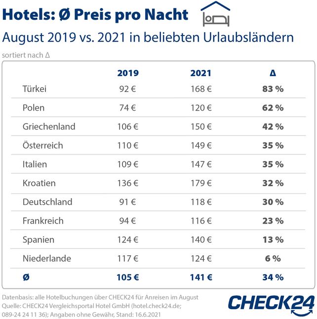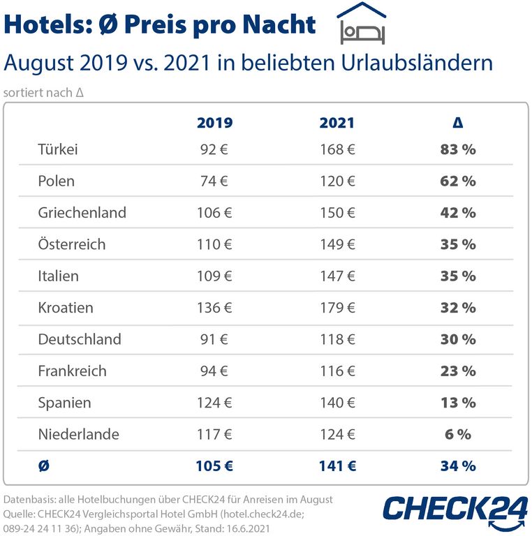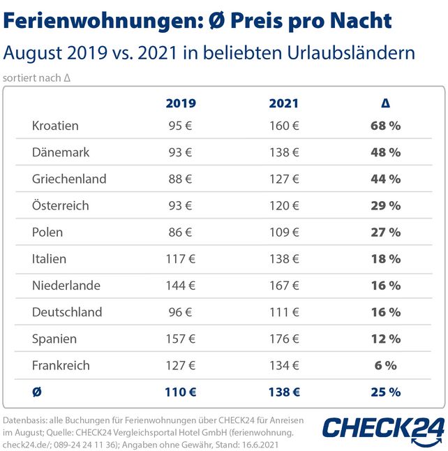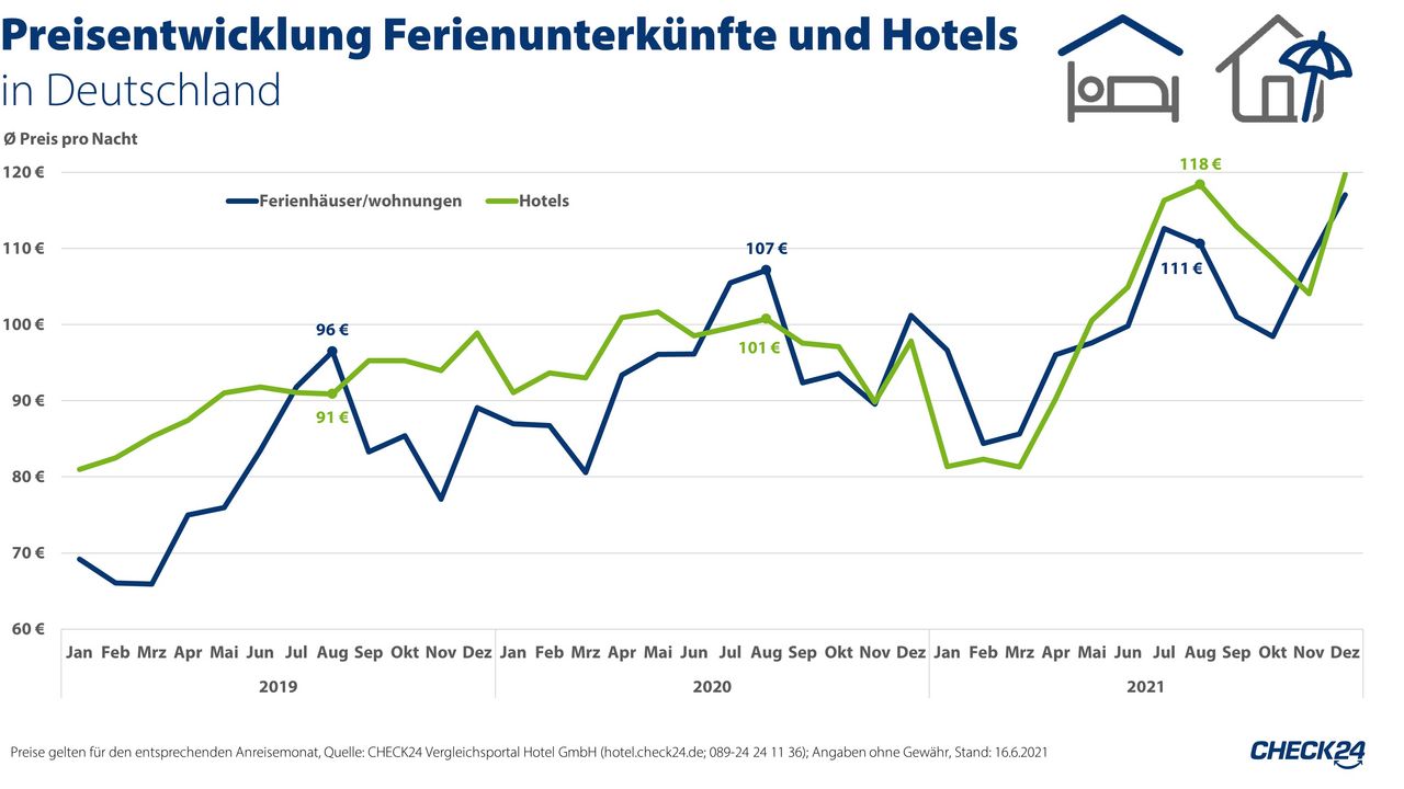 "Die Kapazitäten für Hotels und Ferienhäuser in den beliebten Urlaubsregionen sind begrenzt, gleichzeitig ist die Nachfrage aktuell besonders hoch und dadurch steigen die Preise", sagt Dr. Jan Kuklinski, Geschäftsführer Hotel bei CHECK24. "Grundsätzlich sind die Preise in den Sommermonaten zur Ferienzeit höher. Die Coronapandemie und der stärkere Wunsch nach Urlaub in Deutschland verstärken diesen Effekt. Wer Angebote vergleicht, kann aber auch jetzt noch günstige Unterkünfte finden."
