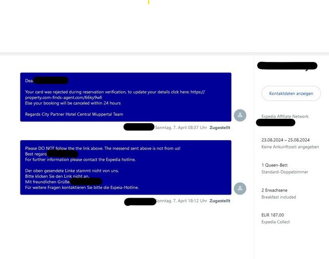 Den Hotelverband Deutschland (IHA) erreicht aktuell die Meldung einer Betrugsmasche über den Messaging-Dienst von Expedia, so der Verband. Diese Betrugsversuche seien bisher fast ausschließlich über die Kommunikationsdienste von Booking.com beobachtet worden. Nun scheine auch Expedia betroffen zu sein.