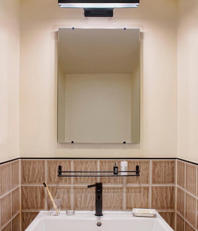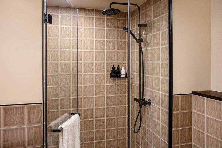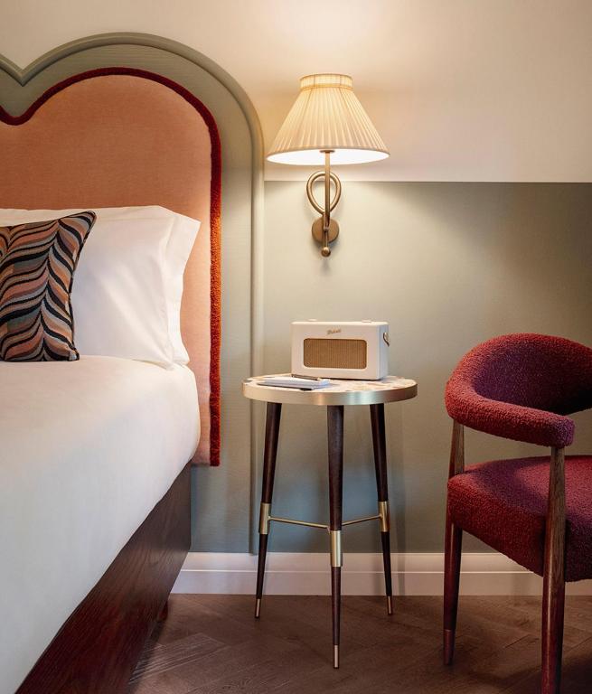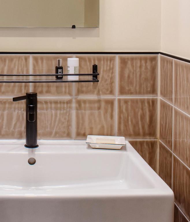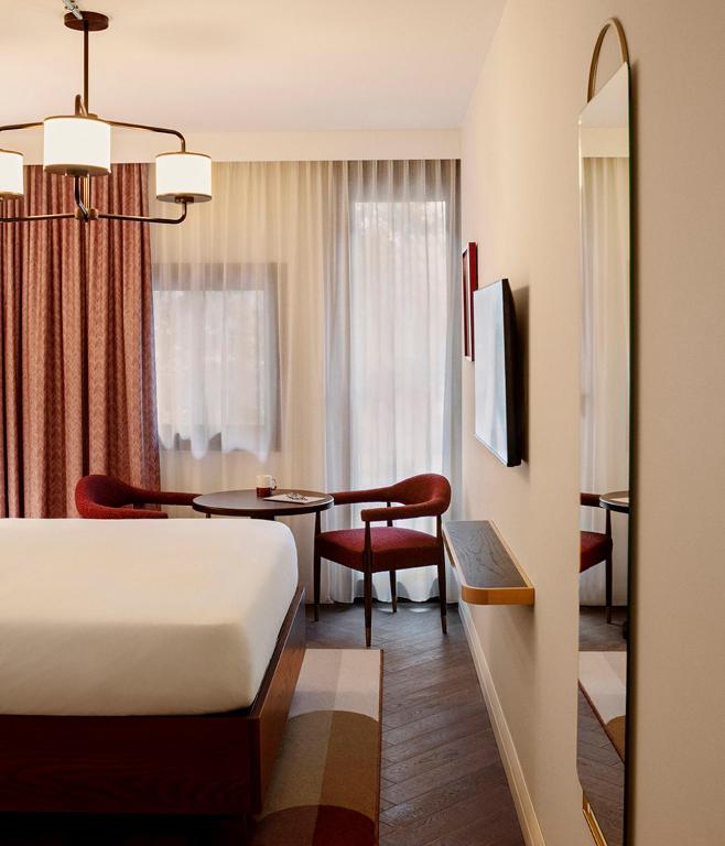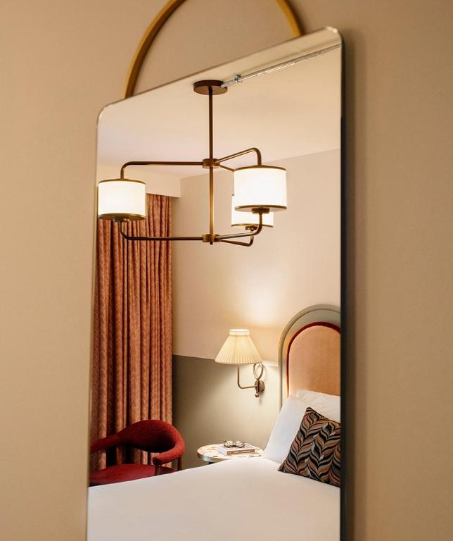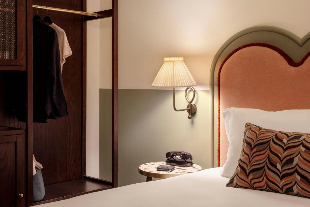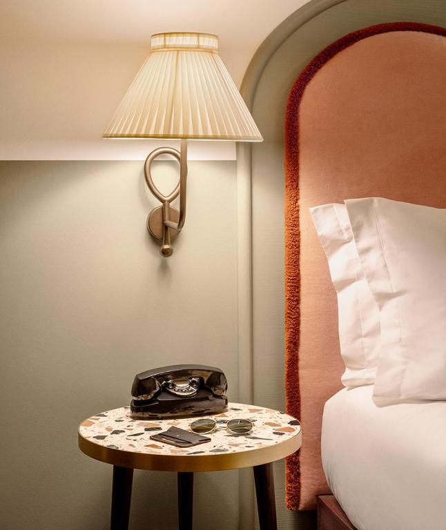 Jedes der 234 Schlafzimmer ist von Jugendstilelementen und ausdrucksstarken Design-Details geprägt, inspiriert von den klassischen architektonischen Strukturen des Viertels. Eine gedämpfte Farbpalette aus entsättigten Rosa- und Grüntönen bildet einen passenden Hintergrund für Möbel im Vintage-Stil und geschwungene Bettkopfteile, deren Muschelmotiv sich in auffälligen Teppichmustern und eleganten, gläsernen Wandleuchten wiederfindet. Wandvertäfelungen und Fischgrätparkett bilden einen strukturellen Kontrast zu den sanften, fließenden Formen der Zimmer. Dieses Nebeneinander erstreckt sich auch auf die Badezimmer, in denen freiliegende Metallregale mit mauvefarbenen Kacheln kombiniert sind.