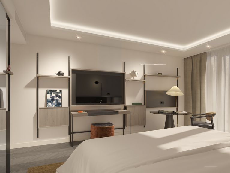 Um die prestigeträchtige Ecklage an der Kennedy-Allee 89 zu betonen, spiegelt die markant geschwungene Fassade des Neubaus – entworfen von Eike Becker, einem der renommiertesten Architekturbüros Deutschlands – den Flusslauf des Mains wider. Das spektakuläre geometrische Design und der kubisch inspirierte Grundriss des Hotels werden durch eine hochwertige Innenausstattung komplettiert, die vom Studio Lux Berlin entworfen wurde und eine Anspielung auf den Designstil der 1960er Jahre ist.