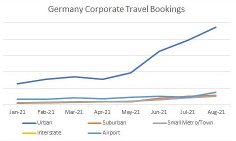 Im August wurde im bisherigen Jahresverlauf die höchste Anzahl von Buchungen für Geschäftsreisen in Deutschland verzeichnet, angetrieben von Standorten in Stadtlage. In Deutschland sind das Transportwesen, die Automobilindustrie/Transportausrüstung sowie die Fertigungsindustrie die treibende Kraft hinter der Erholung der Geschäftsreisebranche.