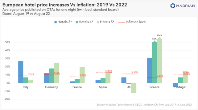 Nach Mabrians Auswertung der August-Daten und unter Berücksichtigung der Inflation sind die Hotelpreise im Jahr 2022 trotz der Erhöhungen in den meisten europäischen Reisezielen immer noch günstiger als im Jahr 2019.