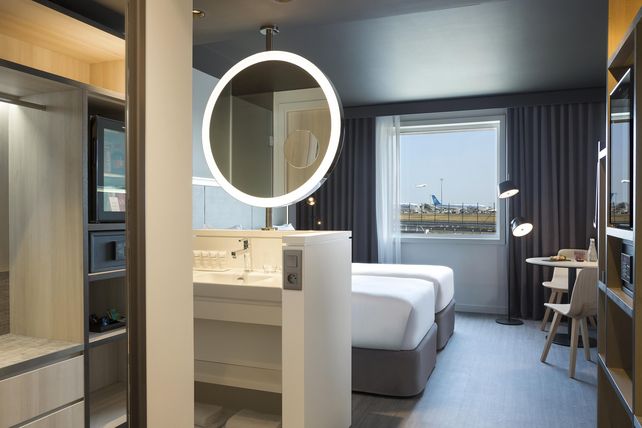 Der Innenarchitekt Jean-Philippe Nuel hat das Flughafenhotel so gestaltet, dass die Gäste während der Reise ihre Batterien wieder aufladen können, ob beim Arbeiten, bei sportlichen Aktivitäten, beim Ausruhen oder auch Spielen. Die offenen Lobbyräumen eignen sich für Meetings, ob privater oder geschäftlicher Natur. In einem der vielen großen Sessel, die vom Pariser Designstudio Bouroullec Brothers entworfen wurden, können sich die Gäste entspannen oder auch einfach die Außenterrasse genießen.