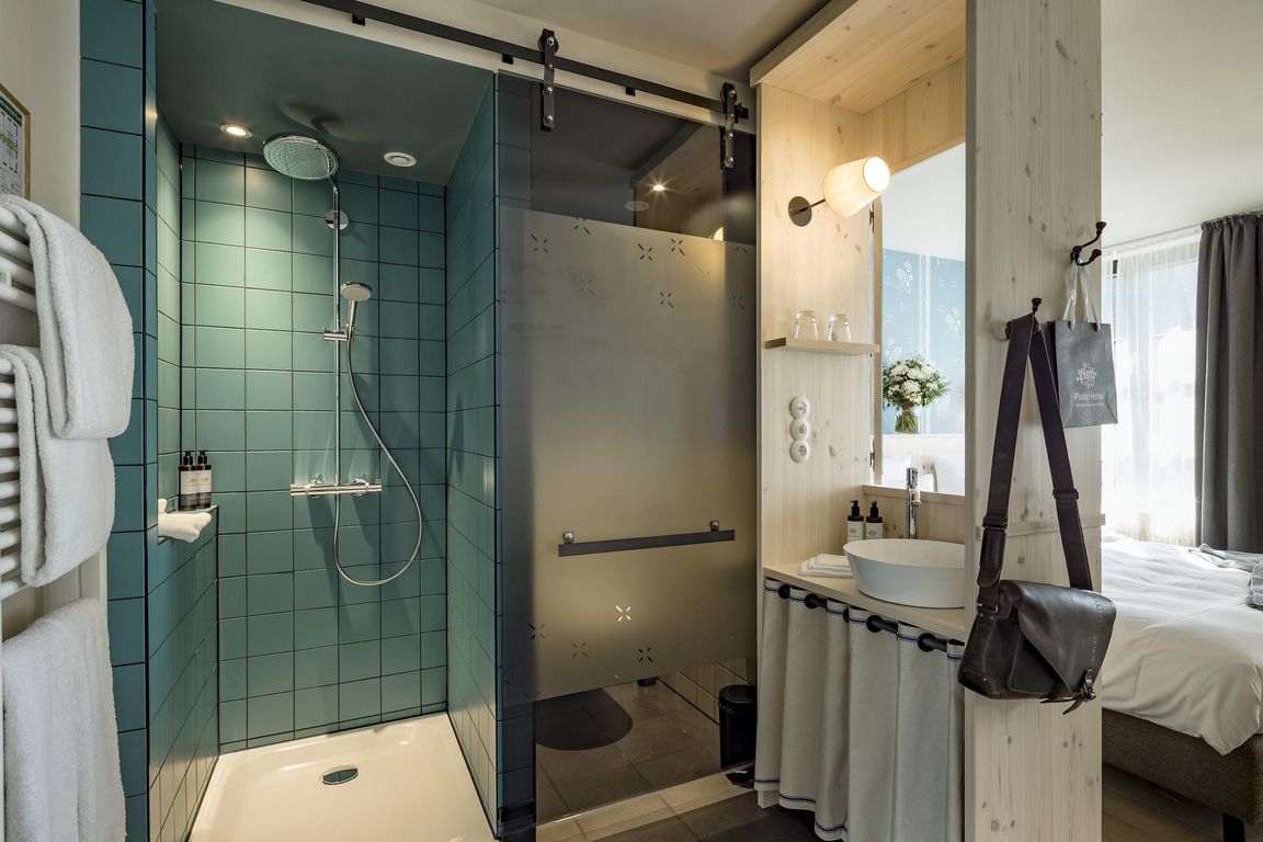Die kleinen, aber feinen Zimmer wirken sehr wohnlich. Sie strahlen Gemütlichkeit, ja so etwas wie Heimeligkeit aus und sollen als kuscheliger Rückzugsort dienen. Alles passt ins Farbkonzept „Bayern Weiß-Blau“ – wobei das Blau eher ein Bleu ist – in Kombination mit einem Eichenparkett und Einbauten aus Kiefer. Das Badezimmer ist halb offen gestaltet und lässt sich mit einer Schiebetür verschließen. Natürlich gibt es ein modernes TV-Gerät und auch W-LAN – auf den ersten Blick jedoch wirken die Zimmer eher nostalgisch. Insbesondere die Kleinigkeiten, wie zum Beispiel die Lichtschalter: die sind aus Bakelit und zum Drehen – wie vor 100 Jahren. So etwas schafft Atmosphäre und bringt den Gast zum Staunen.