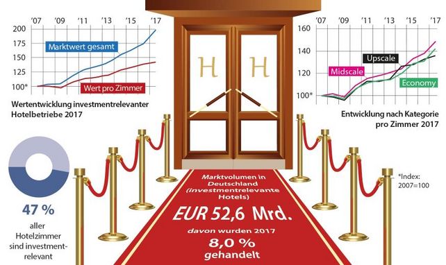 Als investmentrelevantes Angebot wurde von Union Investment und bulwiengesa ein Bestand von rund 375.200 Hotelzimmern ermittelt, die sich auf deutsche Klein-, Mittel- und Großstädte verteilen. Der durchschnittlich ermittelte Wert pro Zimmer lag 2017 bei rund 140.100 Euro. Im Vorjahr lag der entsprechende Wert noch bei 135.600 Euro.