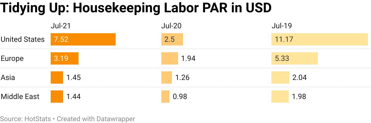 Die Arbeit des Housekeepings ist pro verfügbarem Zimmer weltweit nach wie vor rückläufig. Die Daten zeigen jedoch einige Anzeichen eines Wiederauflebens. Obwohl viele Hotels auf die tägliche Reinigung weiterhin verzichten, bieten einige Marken wie zum Beispiel Omni Hotels & Resorts auf Anfrage immer noch eine vollständige Reinigung an. Omni bietet zudem, wie die meisten anderen Hotels auch, die Möglichkeit einer Teilreinigung an, die eine Auffrischung der Handtücher und eine Müllentsorgung beinhaltet.