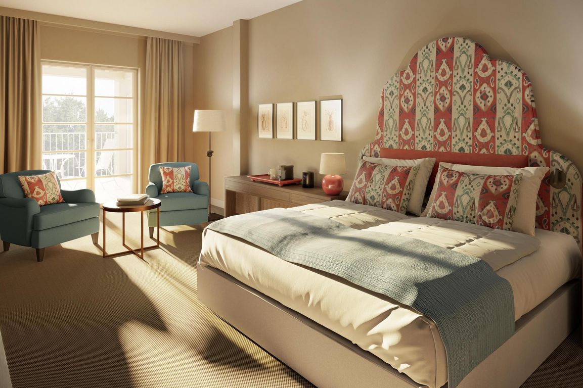 Wenn die letzten Silvestergäste am 2. Januar abgereist sein werden, haben bis Ende April 2024 die Handwerker das Sagen. Sie setzen dann das maritime Gestaltungskonzept von Anne Maria Jagdfeld um, das für alle 122 Zimmer und Suiten zwei Designkonzepte vorsieht. Sandfarbene Wände und aufwendig bestickte, geschwungene Headboards mit Ikat oder Korallen-Motiven geben den Zimmern einen individuellen wohnlichen Charakter. Neue Betten mit großzügigen 2,10 Metern Länge sowie neue Matratzen und Topper schaffen hervorragenden Schlafkomfort. In 20 Zimmern lassen sich die Doppelbetten auch individuell als Einzel-Twinbetten stellen. Das Mobiliar aus Walnussholz gibt den Zimmern eine behagliche Wohlfühlnote. Neue bequeme Sitzmöbel in klassischen Formen und Zero-Waste-Stoffen (100% recycelt) runden das neue Wohnkonzept ab – sei es als Sessel oder Sofa. Und in 20 Zimmern lässt sich das Schlafsofa in ein zusätzliches Bett verwandeln.