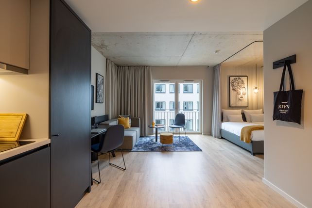 „Düsseldorf gilt als eine der lebenswertesten Städte Deutschlands; ein Gefühl, das Gäste auch bei uns in ihrem Zuhause auf Zeit erfahren sollen“, erklärt Julia Harnischfeger, Managing Director der Upartments Real Estate GmbH. Dafür wählen sie aus fünf verschiedenen Apartmentkategorien zwischen 18 und 44 Quadratmetern. Beim Design setzt Joyn auf urbane Materialien wie unverputzte Betondecken sowie gelbe Farbakzente. Den Innenhof ziert ein großflächiges Wandbild vom Contemporary Street-Art Künstler Emanuel Jesse.